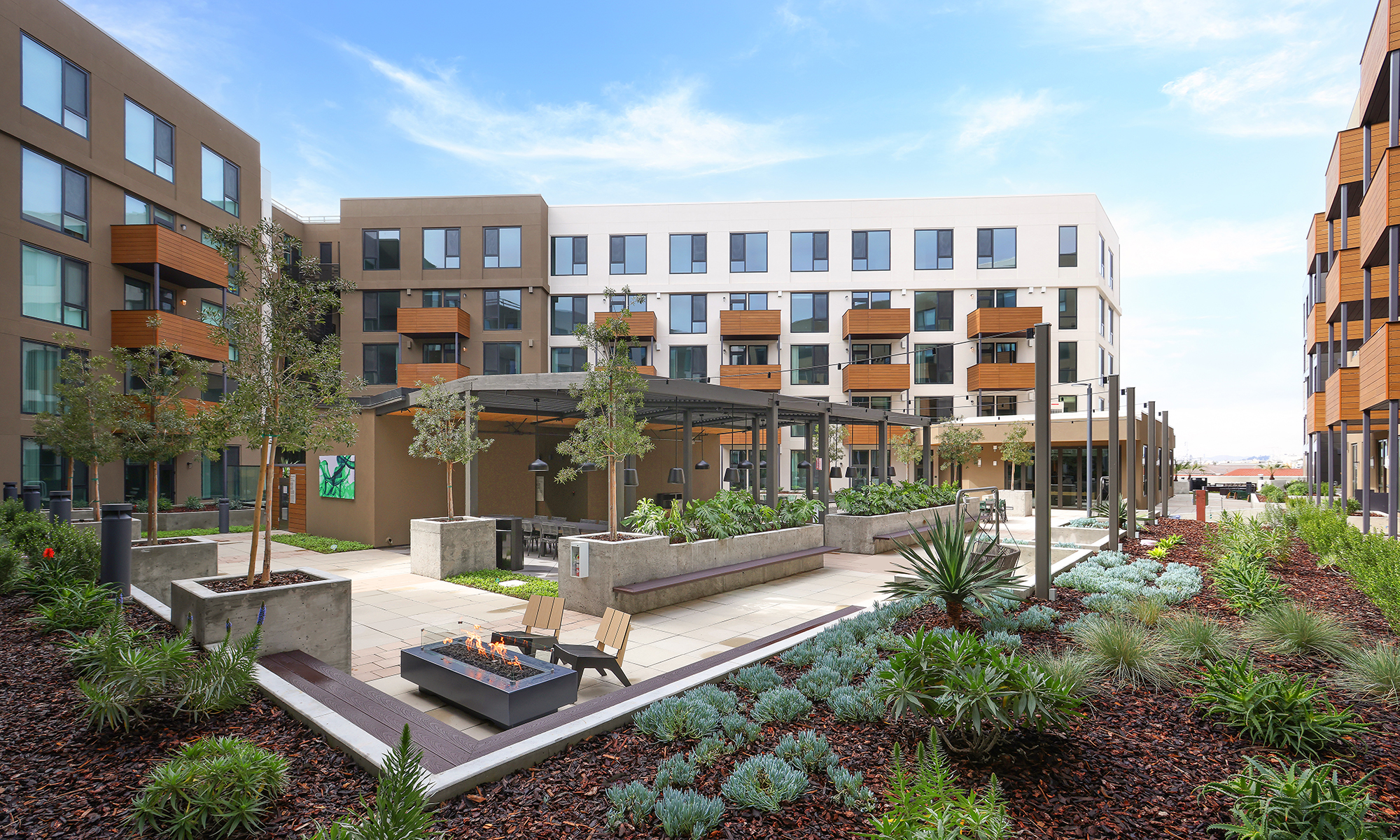 The new high-density mixed-use apartment project on a 5.13 Acre site in Mission Valley, San Diego, provides 267 residential units and 10 shopkeeper units. The Type III apartment building wraps a 5-story Type I parking