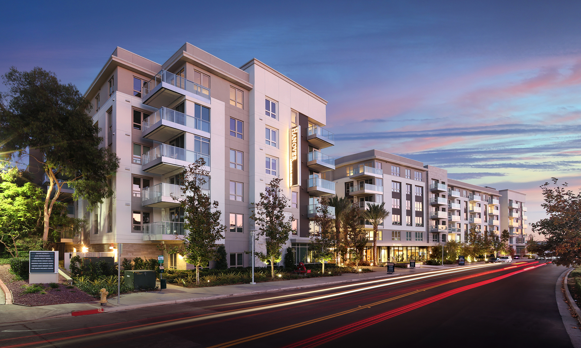 The new high-density mixed-use apartment project on a 5.13 Acre site in Mission Valley, San Diego, provides 267 residential units and 10 shopkeeper units. The Type III apartment building wraps a 5-story Type I parking