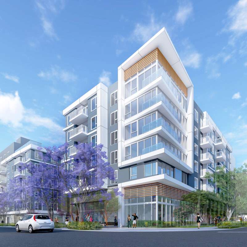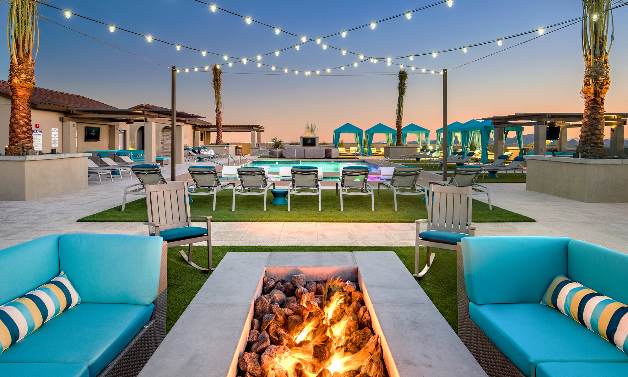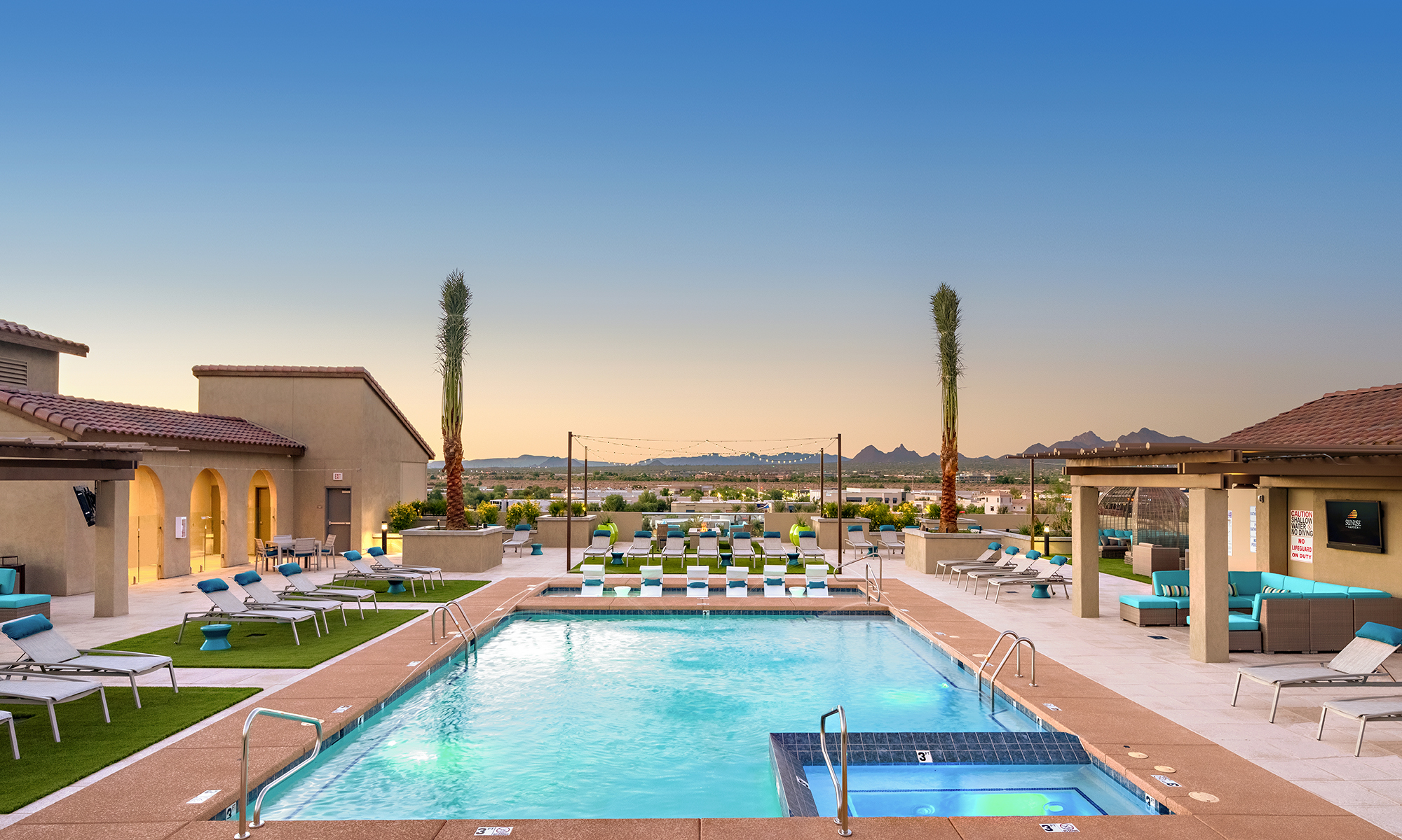 Sunrise Commons is a 282 residential unit community located along Hayden Road on the site of an old vacant automobile dealership in Scottsdale, Arizona. The site was divided in half by the 55 DNL line established by the local Airport Authority. The intent of the project was to rezone the existing Airpark Mixed Use site, to an Airpark Mixed Use Residential classification. The campus provides two uses: a new church facility along the northern side of the 55 DNL line and a residential community along the southern side of the 55 DNL. The campus provides a shared point of access off of Hayden that aligns with North 84th Street. Parking for the residential site was contained to an above grade parking structure that is hidden from view by four levels of residential units. The upper most level of the parking structure contains a pool recreation amenity taking advantage of local views. The fitness, club room and leasing facilities are located within the building with easy access to the pool deck.