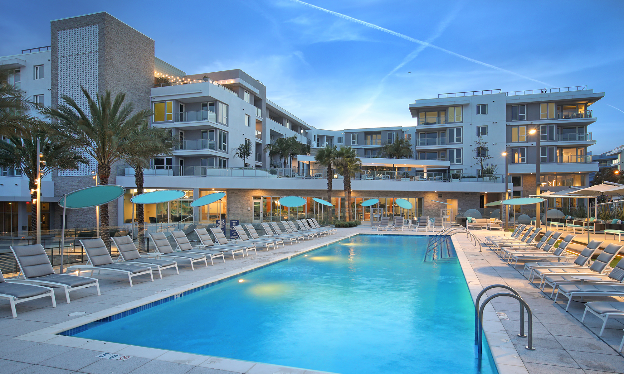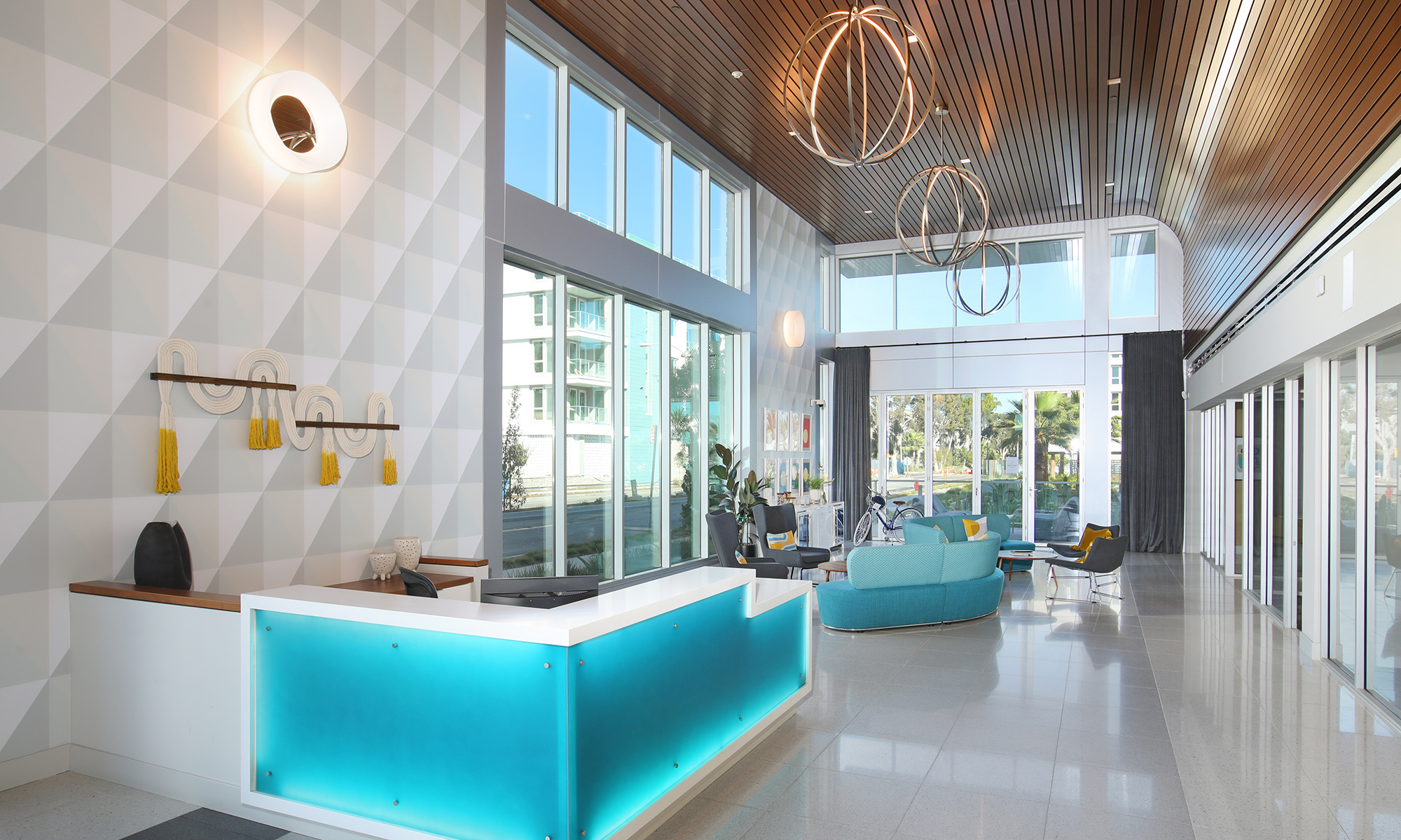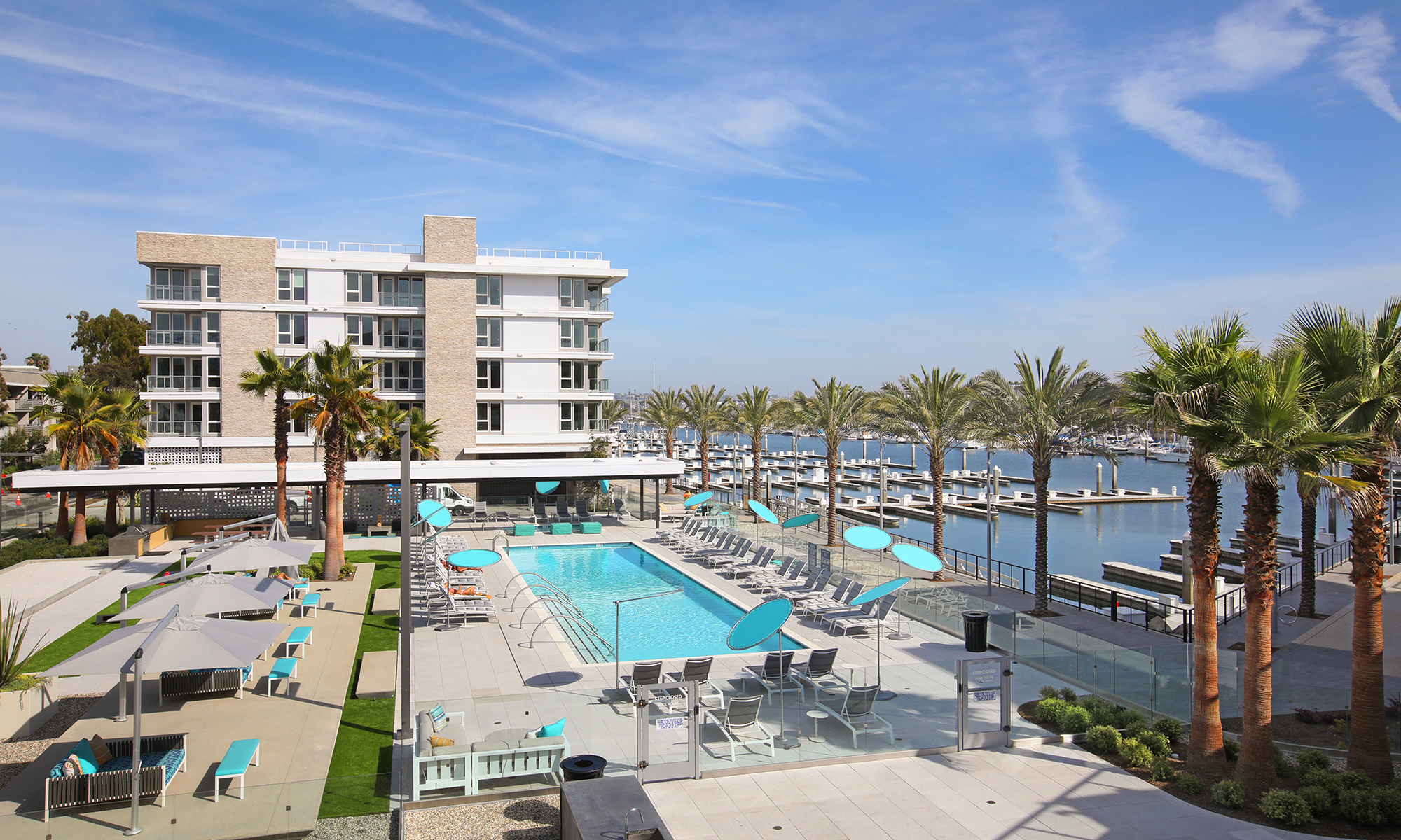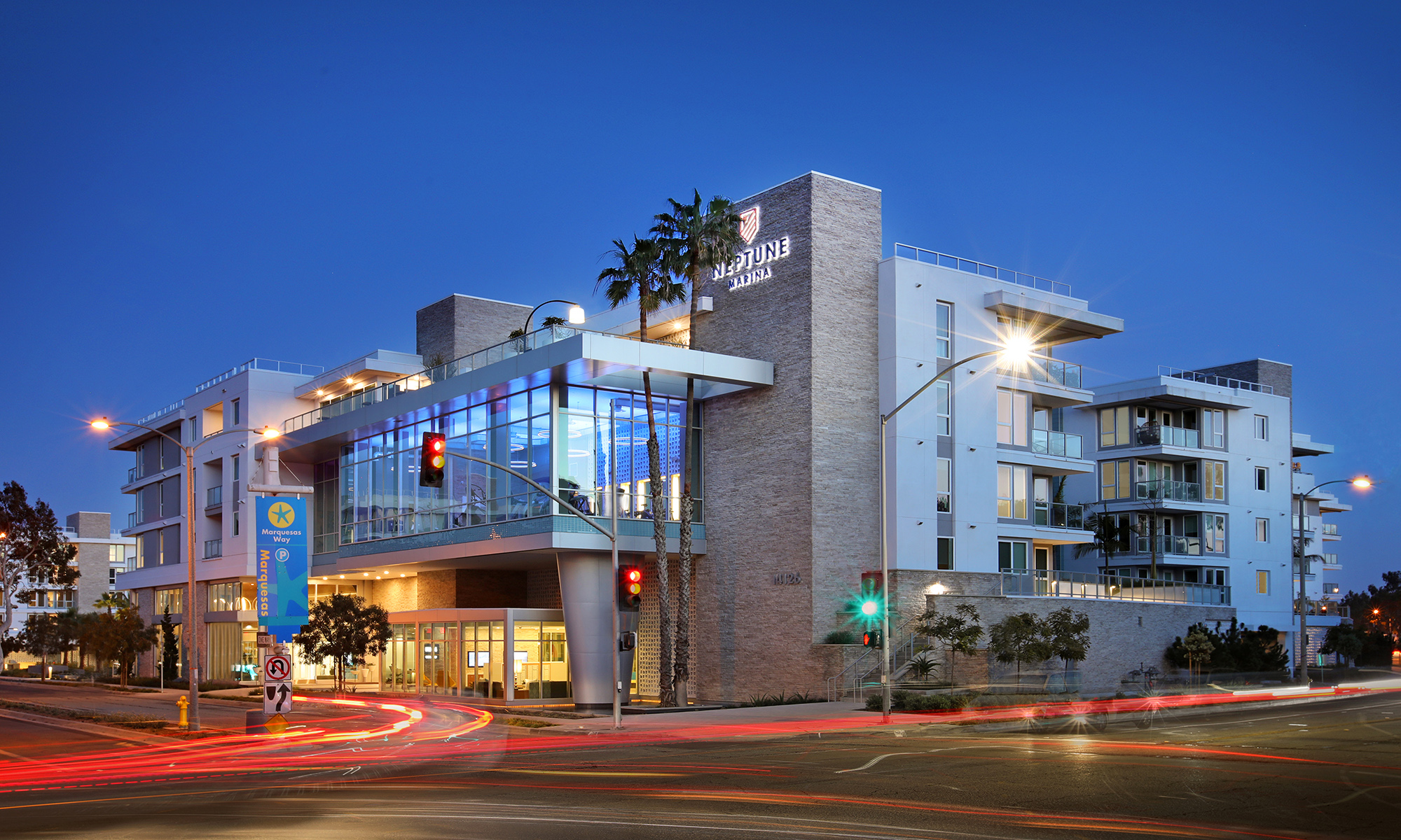 In the city of Marina del Rey, Neptune Marina is inspired by the era of mid-century modern design. The design of Neptune Marina reflects the same timeless quality, clean simplicity, and integration with nature as the mid-century style is known for. The form giving influence of the project is derived from an architectural expression of post and beam with ample windows, open floor plans, and desire to bring the outdoors in. The architecture presents a disciplined use of material that integrates texture, stone accents, and natural color palette with the addition of a modest yet playful splash of color. A conscious effort was made to synthesize vernacular tradition with a modern language to create architecture firmly rooted in its own place and time. Symbolic forms and icons are borrowed from the past, and re-arranged in striking new compositions. The goal is not to attempt to change the course of a culture nor to produce stylistic replicas of a time past, but rather to fuse the current social realities and cultural expressions with the physical experiences of the site’s history.