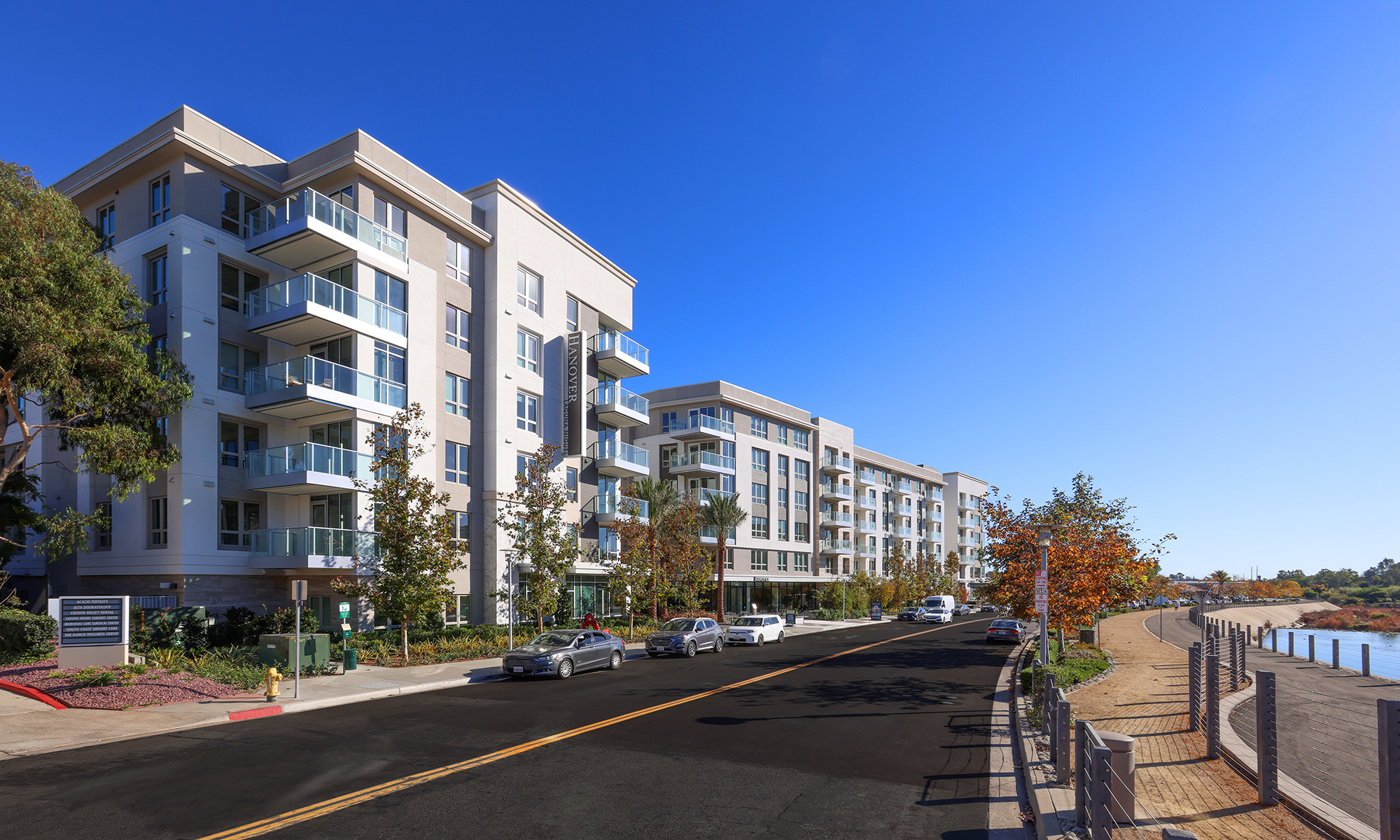 The new high-density mixed-use apartment project on a 5.13 Acre site in Mission Valley, San Diego, provides 267 residential units and 10 shopkeeper units. The Type III apartment building wraps a 5-story Type I parking