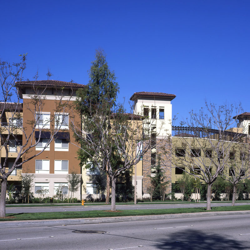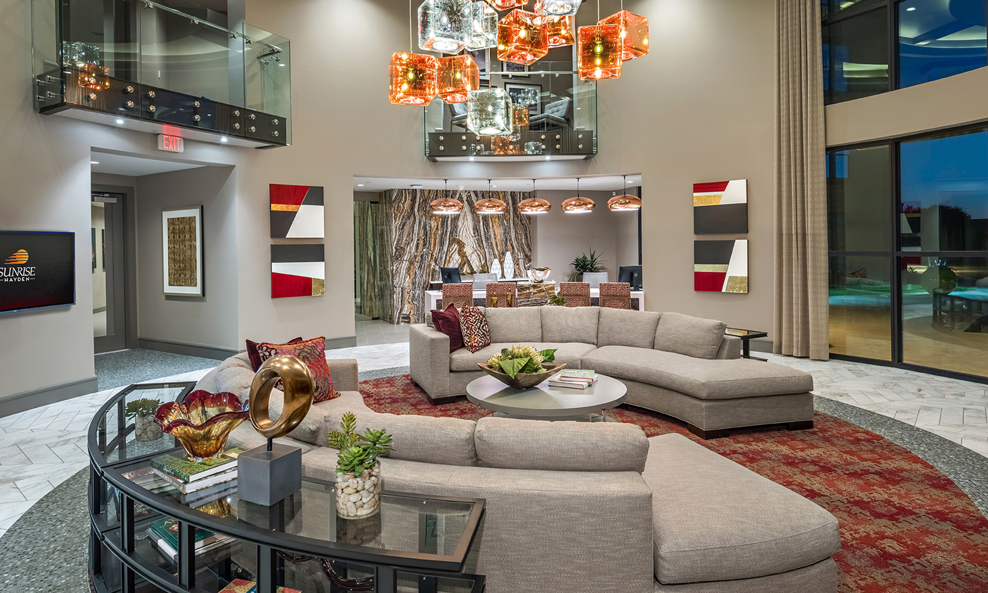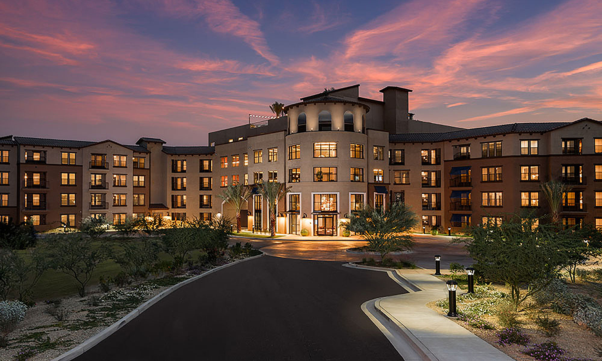 Sunrise Commons is a 282 residential unit community located along Hayden Road on the site of an old vacant automobile dealership in Scottsdale, Arizona. The site was divided in half by the 55 DNL line established by the local Airport Authority. The intent of the project was to rezone the existing Airpark Mixed Use site, to an Airpark Mixed Use Residential classification. The campus provides two uses: a new church facility along the northern side of the 55 DNL line and a residential community along the southern side of the 55 DNL. The campus provides a shared point of access off of Hayden that aligns with North 84th Street. Parking for the residential site was contained to an above grade parking structure that is hidden from view by four levels of residential units. The upper most level of the parking structure contains a pool recreation amenity taking advantage of local views. The fitness, club room and leasing facilities are located within the building with easy access to the pool deck.