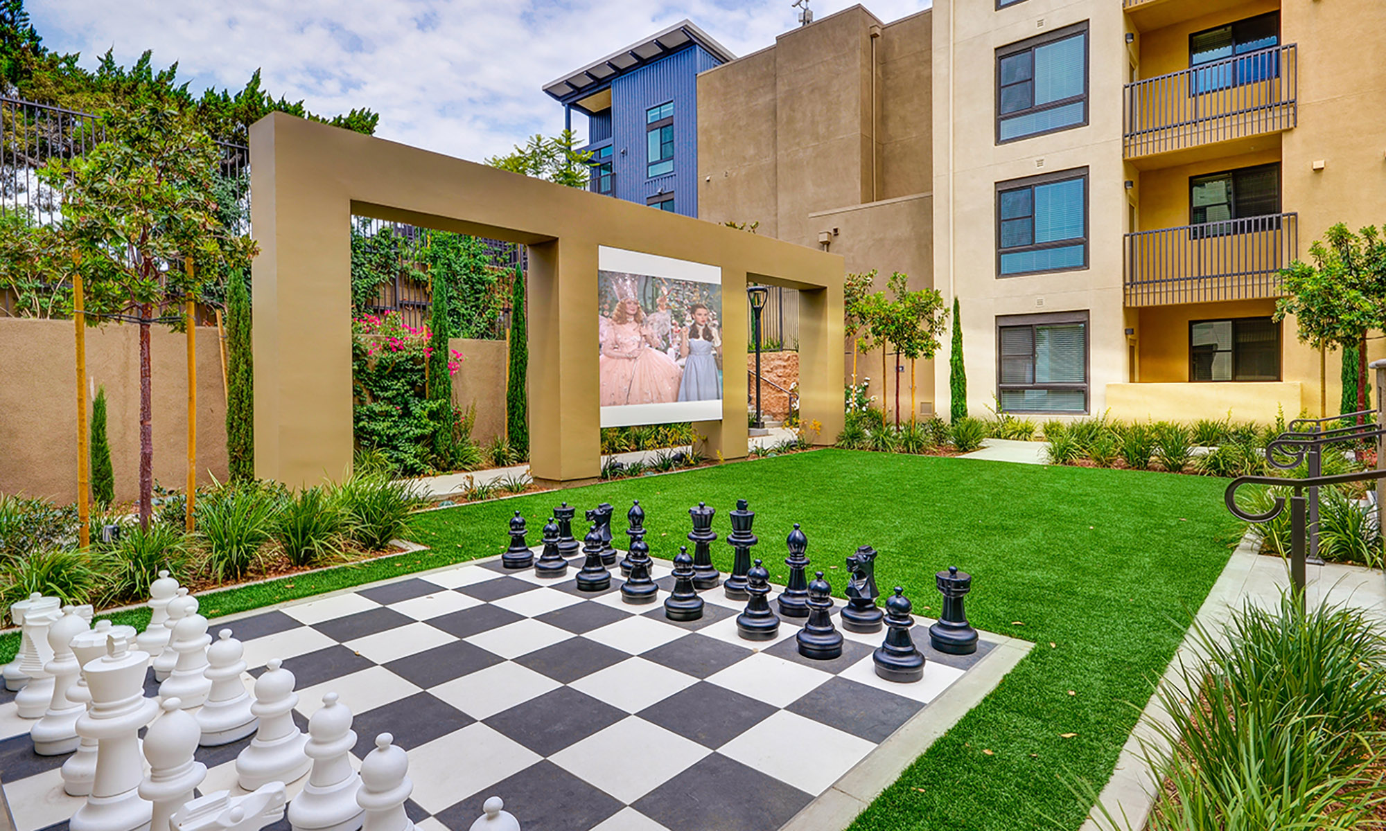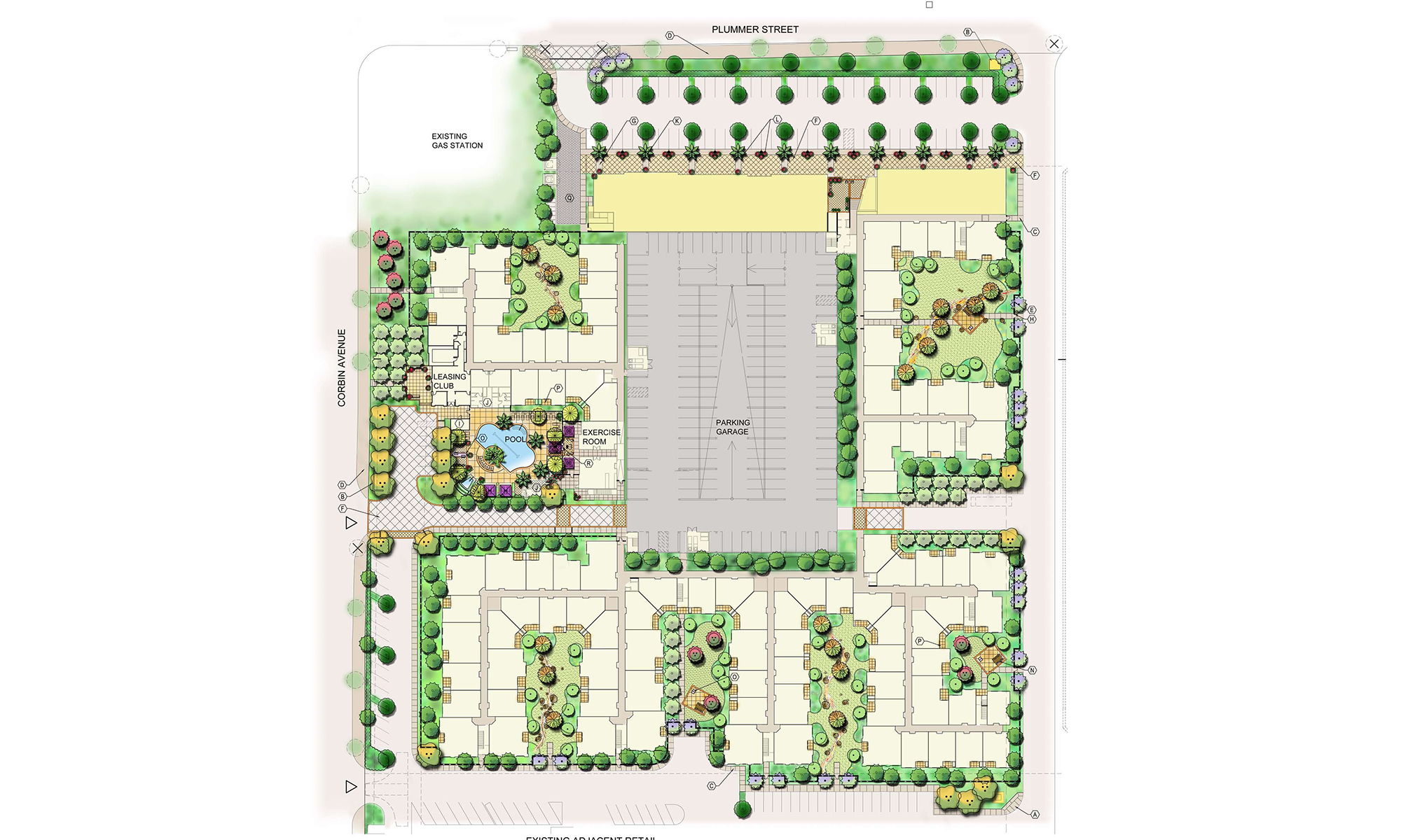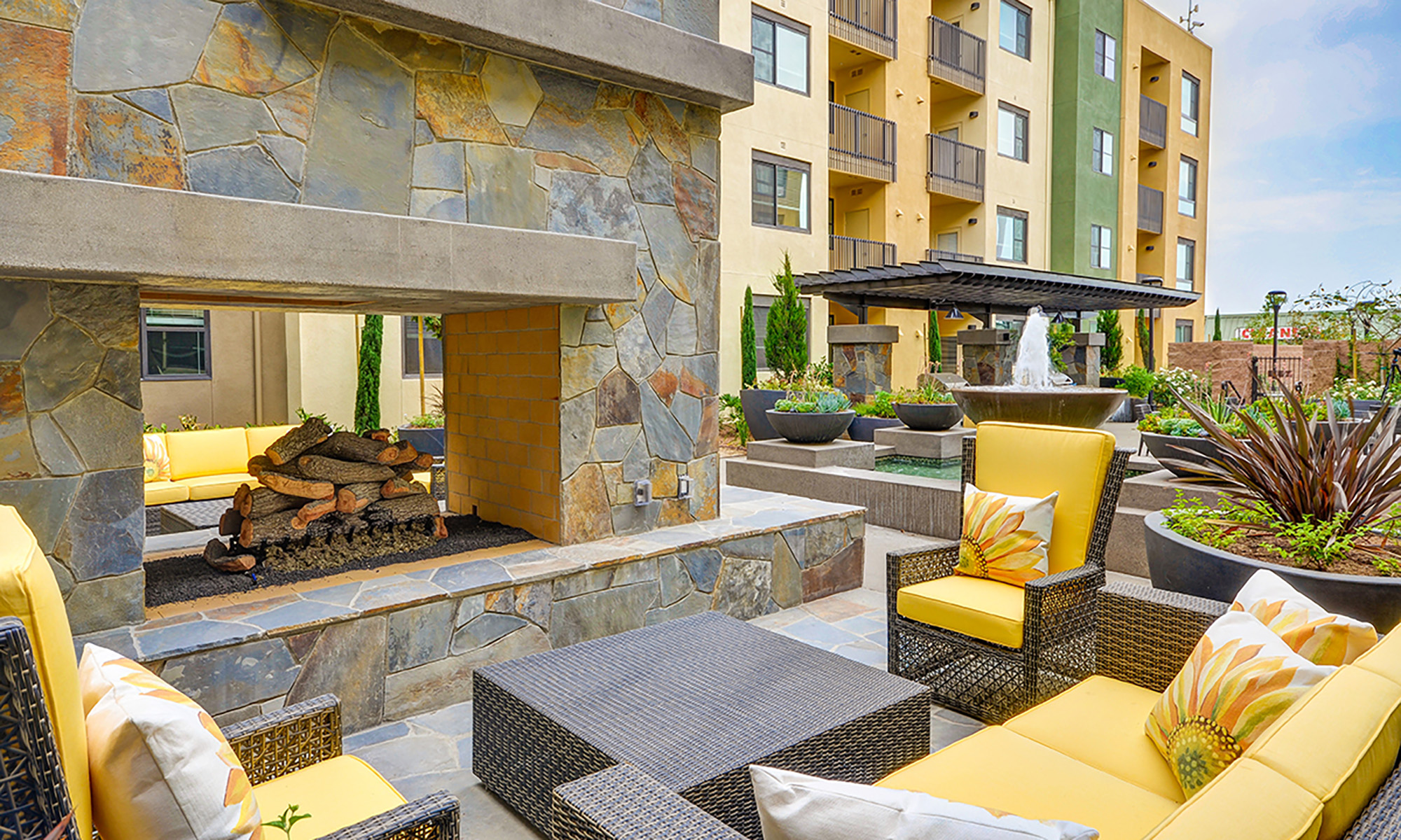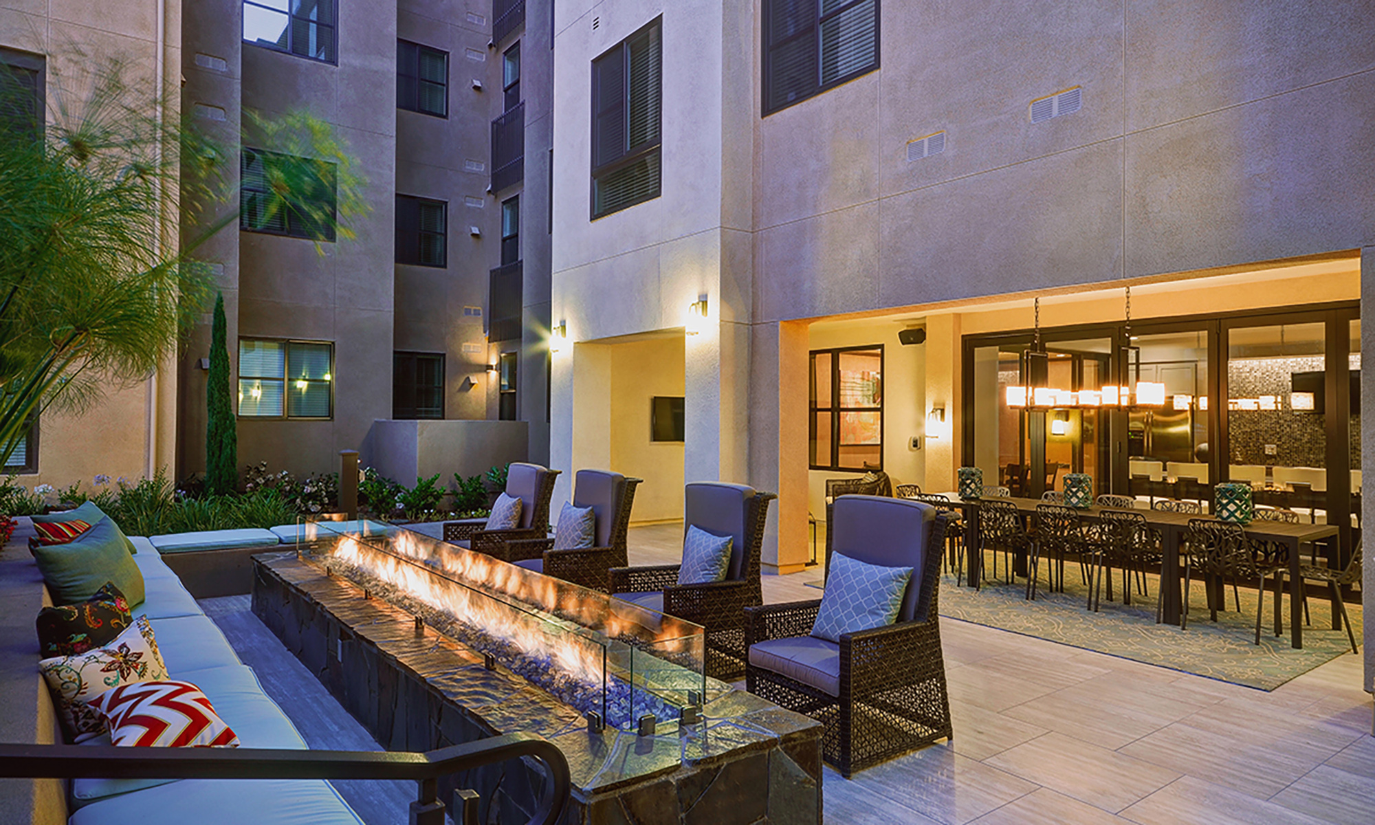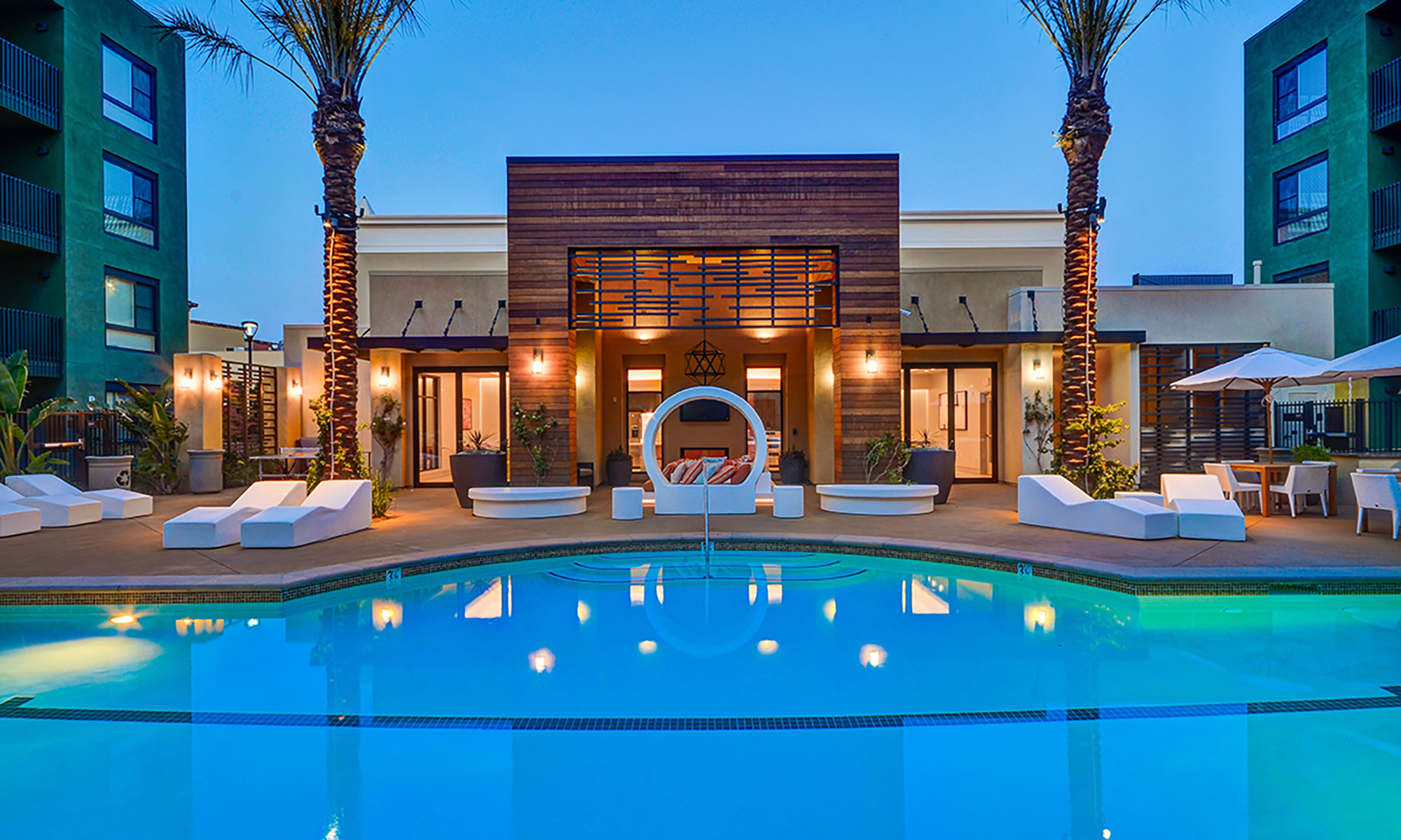 Located in Northridge, Terrena is the result of reclamation of a derelict retail site located along two major arterials in the San Fernando Valley. The mixed-use community is designed to ignite a previously underutilized block and provide 403 market-rate apartments with restaurant and retail space at the ground floor. Parking is in a “wrap” configuration and provides 726 parking stalls for residents and guests. The design of the overall community features edible landscaping including on site community fruit trees; various vegetable gardens and potted herbs. The property also features a salt water infused pool, spa area and outdoor movie theater. There are multiple outdoor fireplaces with seating areas; barbeques with tables to enjoy meals with friends; and an indoor/outdoor club house that features a demonstration kitchen, billiards and ping pong tables. Other indoor amenities include: a business center with Apple touch screen computers; a conference center for meetings, a sizable athletic center with state of the art fitness equipment; a pet spa to groom pets.